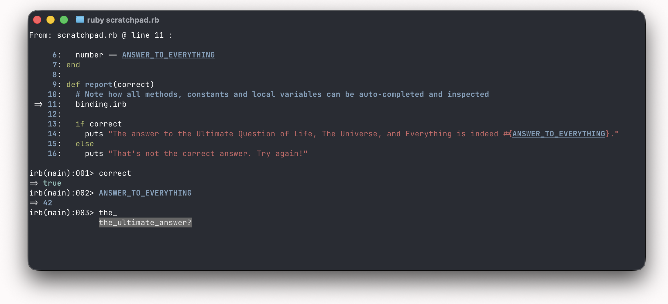 When IRB is started via binding.irb, it has access to the full context of the code where it was called, including all local variables, methods, and constants. Since it's just a regular IRB session, we also get to enjoy all the recent IRB developments like auto-completion, syntax highlighting and multi-line editing, which the dedicated debuggers often lack.